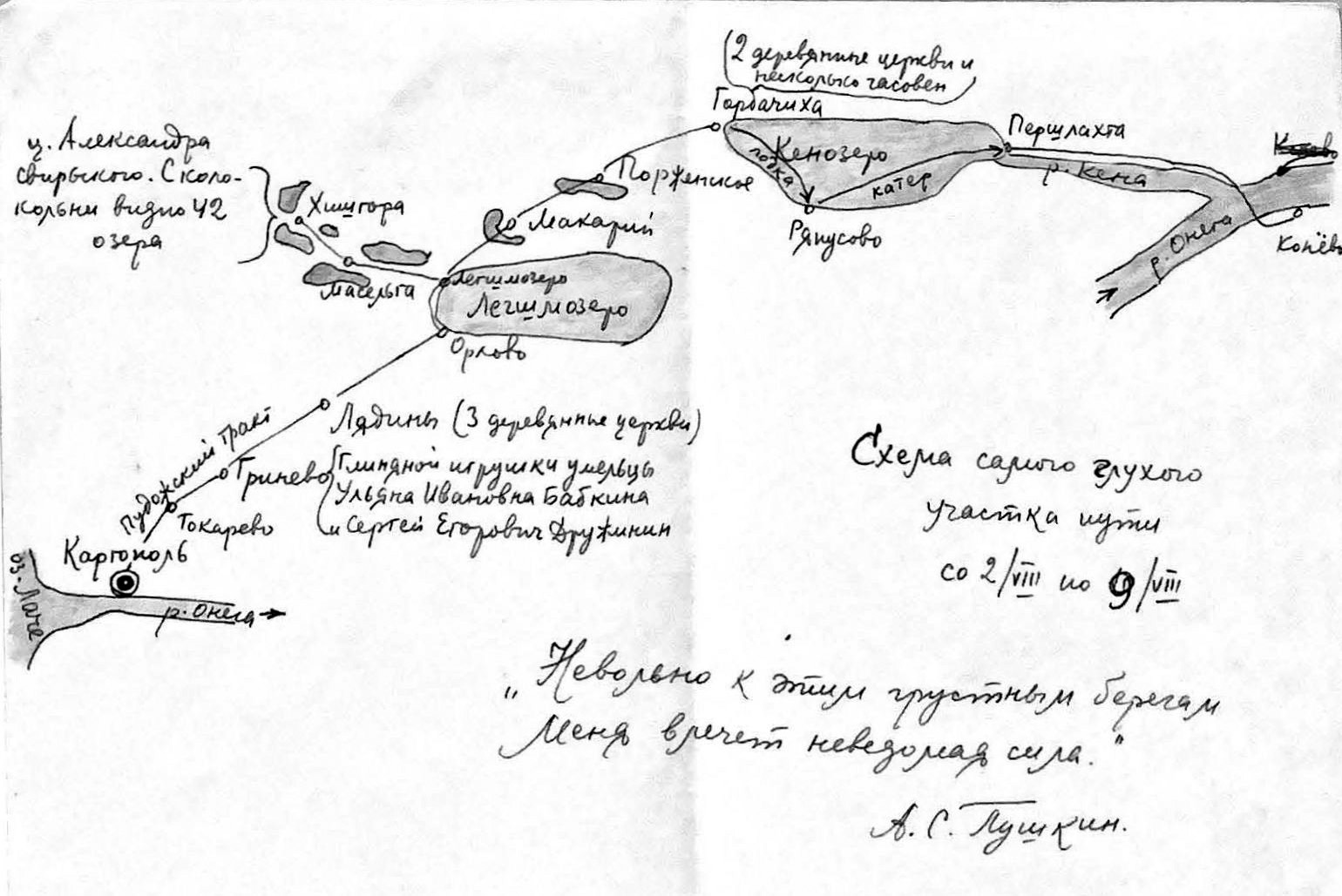 Путь лежал: Ферапонтово – Устье (красивая деревня меж озер) 10 км пешком – Чарозеро (машина) – берег реки Совзы (11 км пешком) – по берегу лесом звериными тропами 15 км до села Совзы – исток реки Свиди из озера Воже (правдами и неправдами) – по реке Свиди (под парусом и на веслах с большим риском, т. к. плаваю, как топор, 18 км до села Погост со знаменитой деревянной церковью – катером через Лаче озеро до Каргополя. Встречали древности, но держимся принципа: ничего не вывозить.